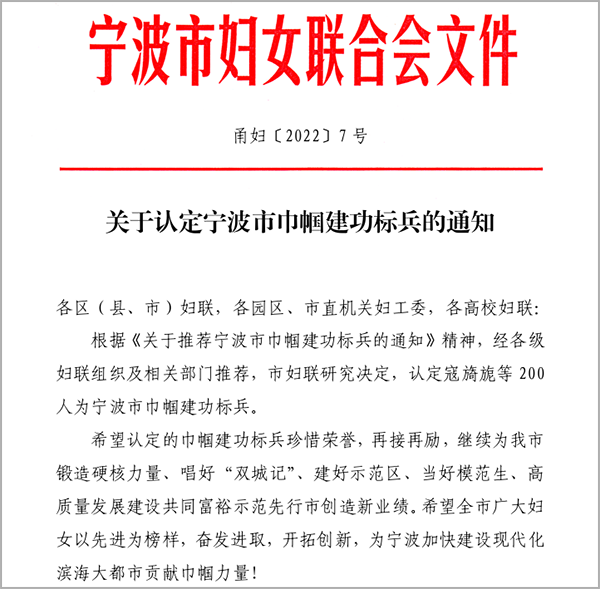 為深入學(xué)習(xí)貫徹習(xí)近平新時(shí)代中國(guó)特色社會(huì)主義思想和黨的十九屆歷次全會(huì)精神,進(jìn)一步鼓勵(lì)廣大婦女愛(ài)崗敬業(yè)、創(chuàng)先爭(zhēng)優(yōu),推動(dòng)形成學(xué)本領(lǐng)、提素質(zhì)、講奉獻(xiàn)、比業(yè)績(jī)的良好氛圍,為寧波高質(zhì)量發(fā)展建設(shè)共同富裕先行市貢獻(xiàn)半邊天力量。近日,寧波市婦聯(lián)評(píng)選認(rèn)定了200人為寧波巾幗建功標(biāo)兵,奉化區(qū)11名優(yōu)秀女性獲此殊榮,寧波一機(jī)閥門(mén)制造有限公司常務(wù)副總經(jīng)理——梁金寅,成功入選。